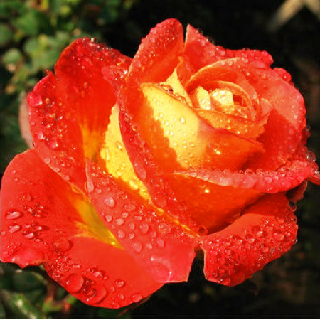 Кусты вырастают мощными и крепкими. Длина побегов в среднем равна 80 см, а ширина кроны – 60 – 80 см. Листья насыщенно-изумрудного цвета, с глянцевой поверхностью. Саженцы обходятся без опоры. На макушках стеблей формируются роскошные бокаловидные бутоны, диаметром 10 – 14 см. Лепестки аккуратно уложены по спирали. У основания они желтые, а далее постепенно приобретают розовые тона. Ближе к краям они становятся ярко-красными. Период цветения длится от 7 до 15 дней. Роза источает приятный и ненавязчивый аромат.
